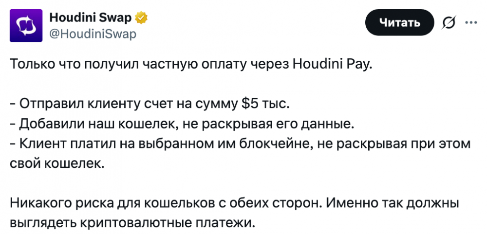 «Houdini Pay — это соответствующая нормативам инфраструктура приватности», которая «никогда не хранит, не контролирует и не получает доступ к криптовалюте пользователей».