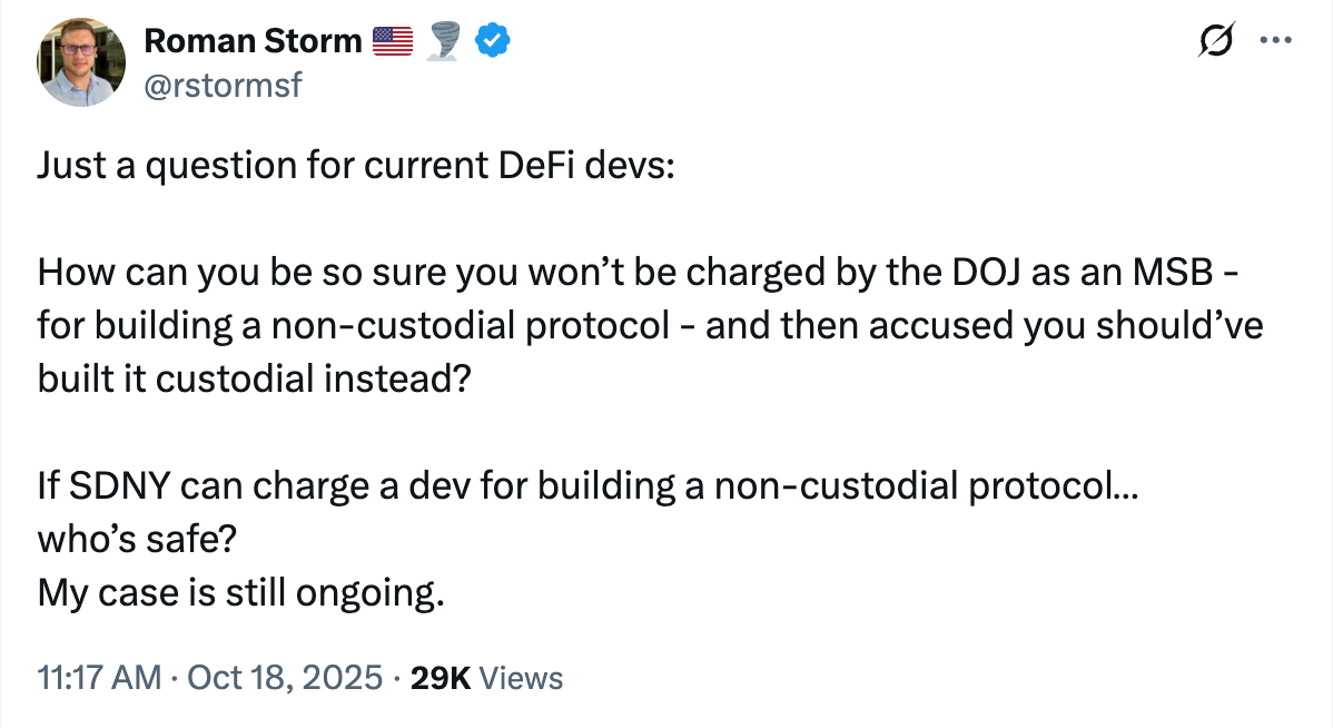 Роман Шторм, разработчик протокола сохранения конфиденциальности Tornado Cash, спросил сообщество разработчиков программного обеспечения с открытым исходным кодом, обеспокоены ли они тем, что Министерство юстиции США может ретроактивно привлечь их к ответственности за разработку платформ децентрализованных финансов (DeFi). Шторм спросил разработчиков DeFi: