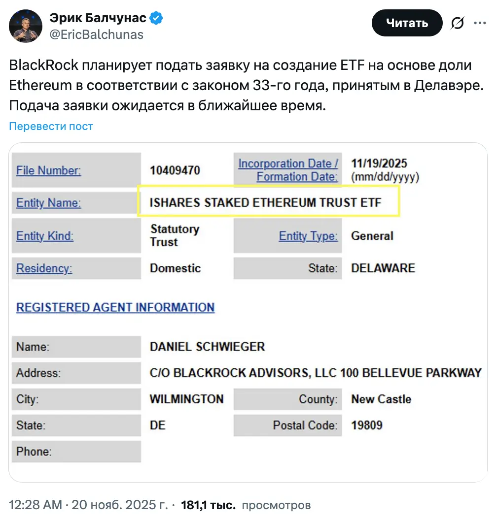 Как сообщалось ранее, BlackRock зарегистрировала в Делавэре новый биржевой фонд с размещением эфира в стекинге. Этот шаг означает начало диверсификации гиганта управления активами с капиталом $13,5 трлн в продукты на основе Ethereum.