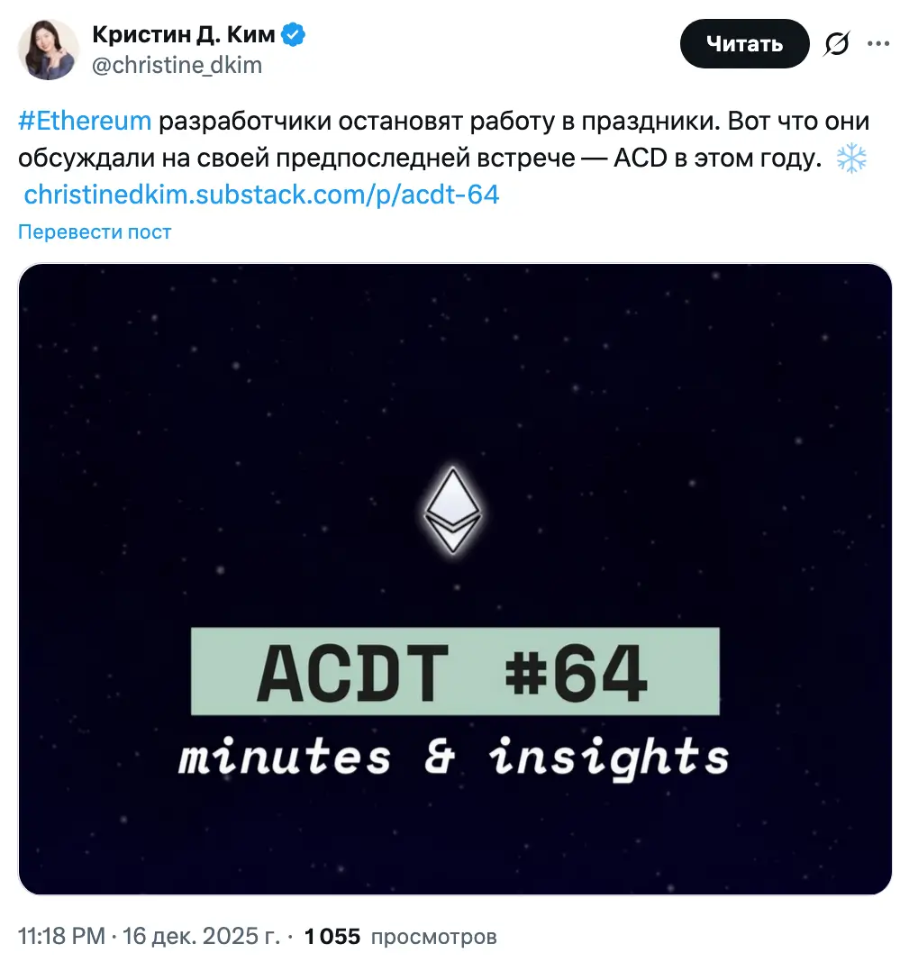 Вице‑президент исследовательской команды Galaxy Digital Кристин Ким в понедельник поделилась итогами встречи All Core Developers. Представители Nethermind заявили, что разработчики должны быть готовы к повышению лимита газа после следующего хардфорка BPO 7 января.