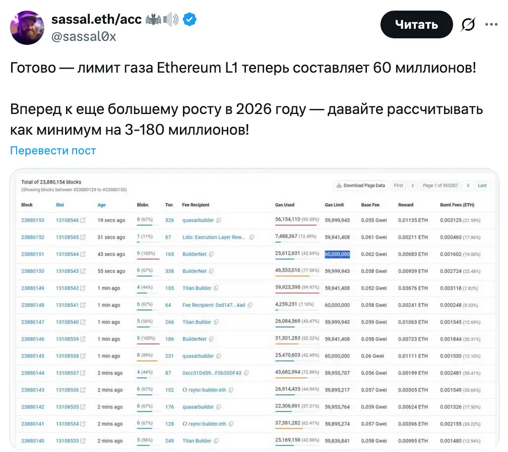 В январе Ethereum может стать еще быстрее: разработчики обсуждают повышение лимита газа до 80 млн в преддверии следующего хардфорка, устанавливающего параметры блобов (BPO).