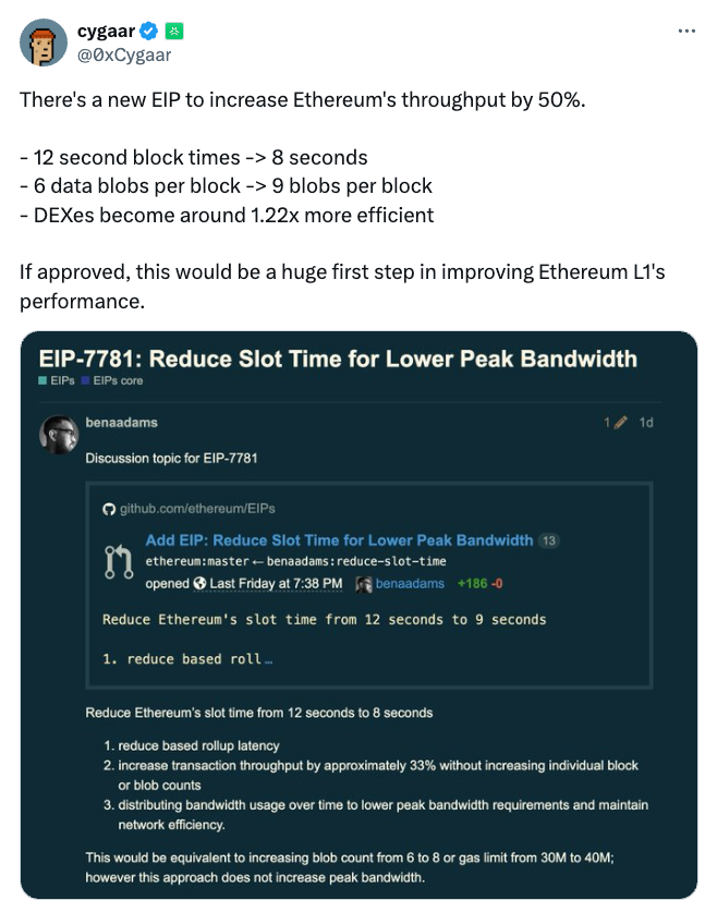 В сообщении от 6 октября в X разработчик Pseudonymous Cygaar сказал, что EIP-7781 станет «первым огромным» шагом на пути к улучшению базового уровня сети Ethereum, поскольку основное внимание разработчиков сосредоточено на сетях Ethereum Layer 2 как решениях по масштабированию.