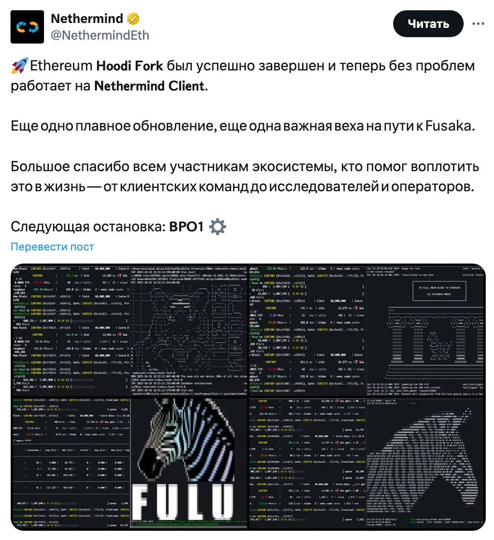 «Еще одно успешное обновление, еще один ключевой этап на пути к Fusaka», — заявила Nethermind в публикации в X во вторник после того, как ее широко используемый клиент валидатора завершил форк.