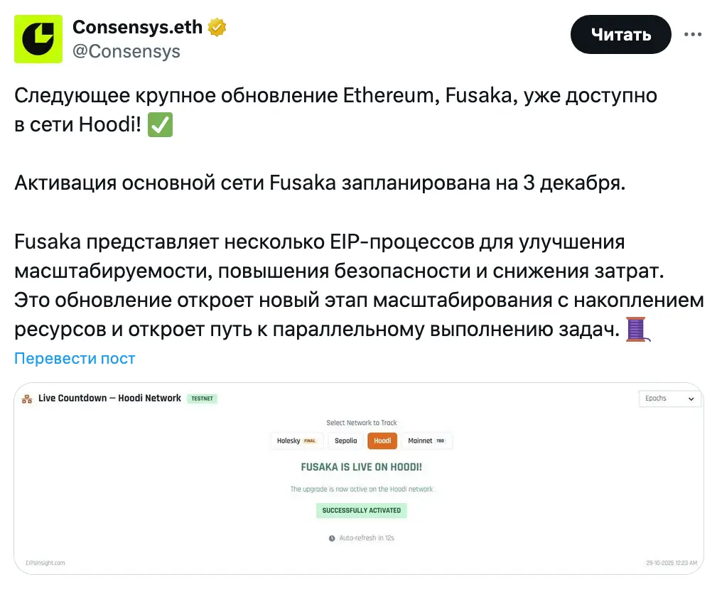 Следующее крупное обновление Ethereum, Fusaka, успешно работает в финальной тестовой сети блокчейна Hoodi. Это открывает путь для его запуска в основной сети 3 декабря, который должен добавить несколько улучшений масштабируемости и безопасности.
