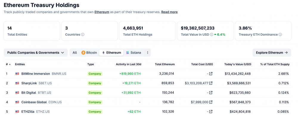 Топ-5 компаний ETH-казначейства. Источник: Coingecko