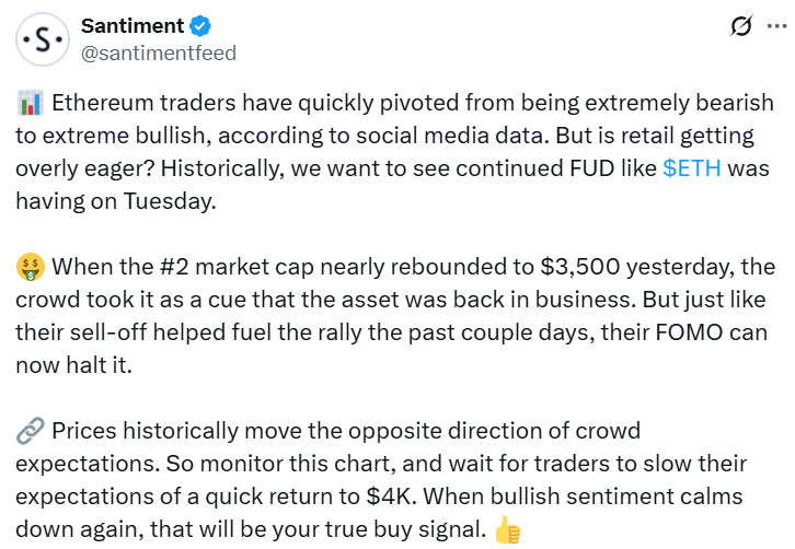 «Трейдеры Ethereum быстро перешли от крайне медвежьих настроений к крайне бычьим», — заявили в Santiment, добавив, что, когда ETH «вчера почти восстановился до $3500, толпа восприняла это как сигнал о том, что актив снова в деле».