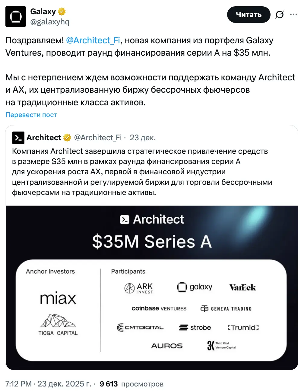 Во вторник издание The Information сообщило, что стартап Харрисона Architect Financial Technologies использует привлеченные средства для создания институциональной торговой платформы. Она будет охватывать деривативы, акции, фьючерсы и цифровые активы. В раунде финансирования участвовали Miax, Tioga Capital, ARK Investment, Galaxy и VanEck.