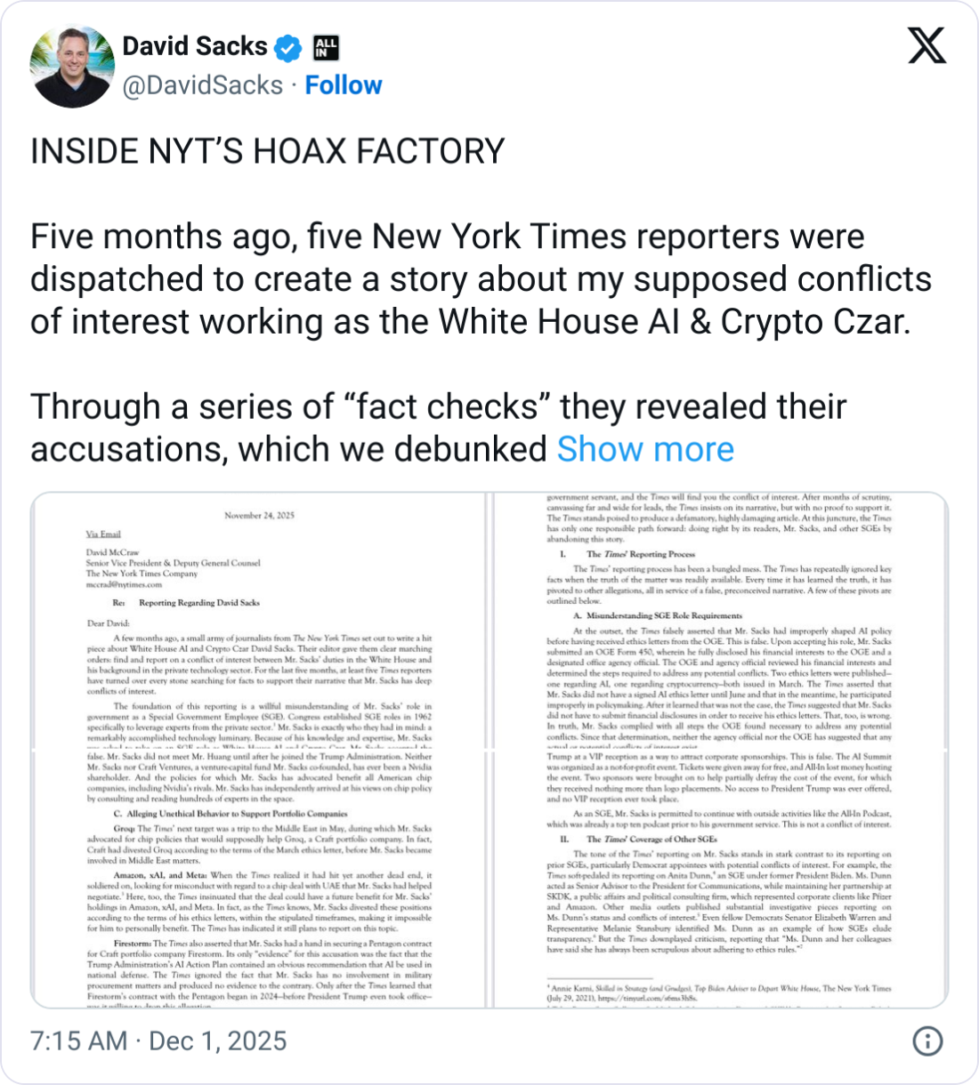 Дэвид Сакс, отвечающий в Белом доме за искусственный интеллект и криптовалюту, ответил The New York Times на статью, в которой подробно рассказывалось о том, как его роль советника в правительстве может быть выгодна его инвестициям и близким партнёрам.