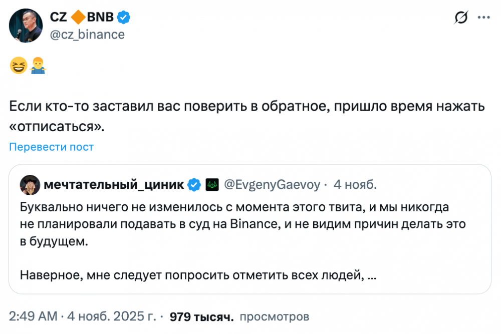 Экс-генеральный директор Binance Чанпэн Чжао также высказался по этому поводу, посоветовав своим 10,4 млн подписчикам в X всегда проверять информацию в «официальных источниках».