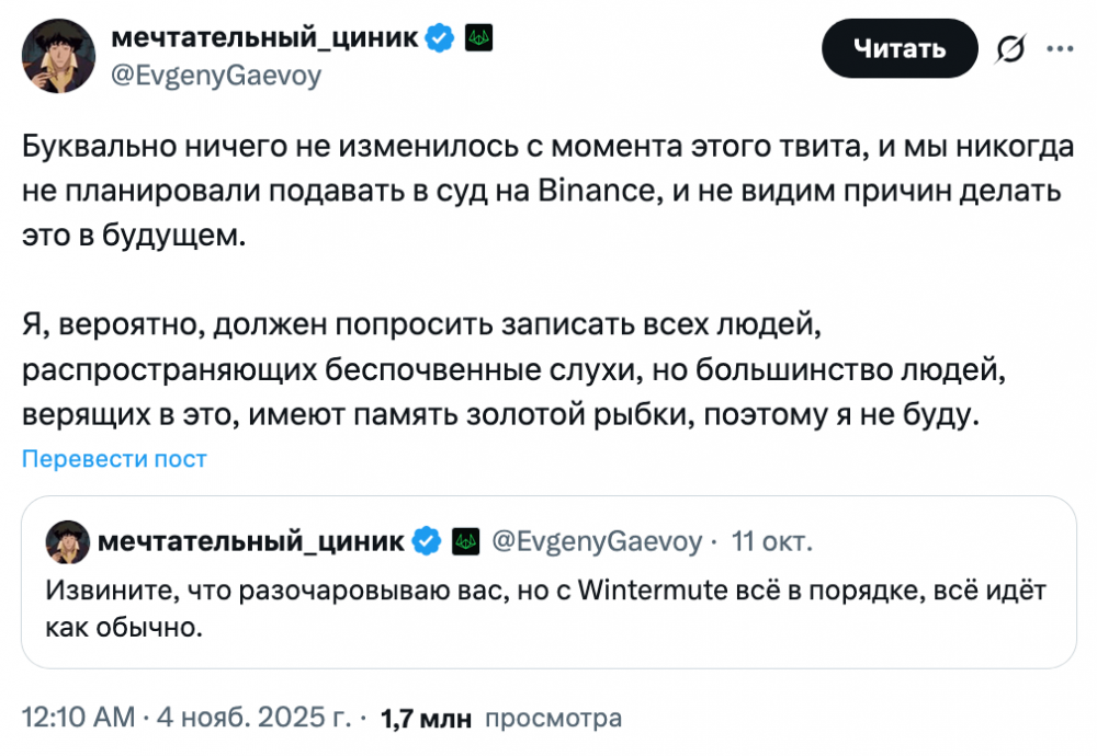 В социальных сетях утверждалось, что ликвидность Wintermute пострадала из-за сбоя в механизме автоматического снижения рисков Binance во время обвала 10 октября. Тогда курс биткоина упал с $121 560 до отметки ниже $103 000 после заявления президента США Дональда Трампа о тарифах.