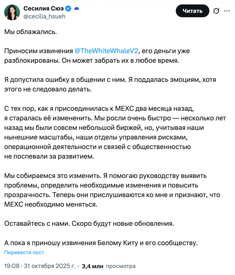 В публикации на платформе X в пятницу стратегический директор MEXC Сесилия Сюэ заявила, что биржа «допустила ошибку» в ситуации с пользователем по имени White Whale. В июле MEXC заблокировала $3,1 млн средств трейдера, предположительно из-за «правил контроля рисков» площадки.