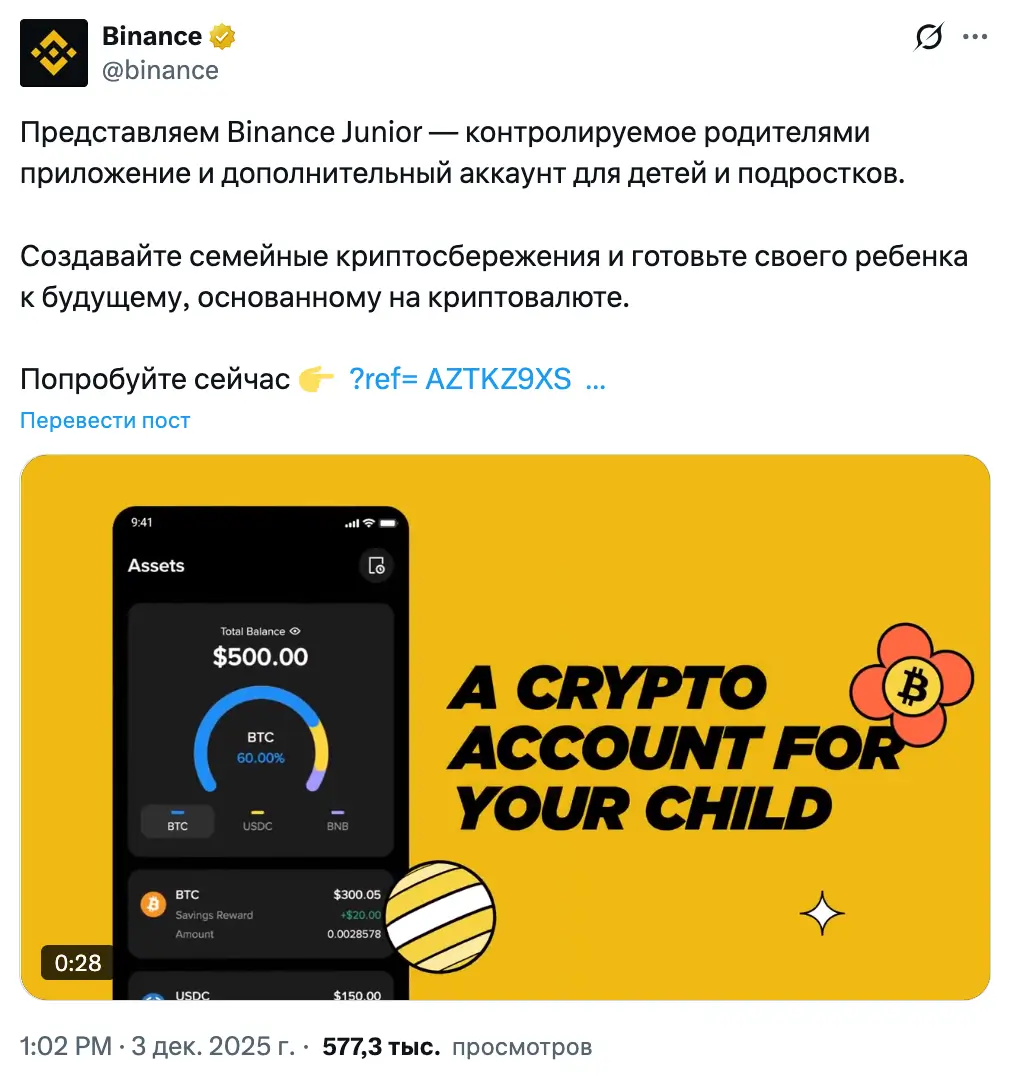 Binance запустила приложение Binance Junior, позволяющее несовершеннолетним работать с криптовалютой под надзором родителей. Это решение породило активные дискуссии о допустимости знакомства детей с цифровыми активами.