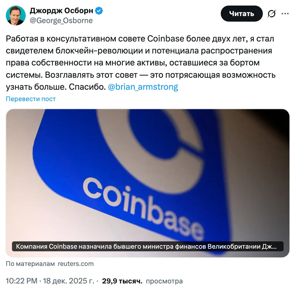 Решение о назначении Осборна, который начал работать консультантом Coinbase в 2024 году в период противостояния компании с Комиссией по ценным бумагам и биржам США (SEC), — часть стратегии Coinbase по расширению влияния на зарубежные правительства, сообщает Reuters.