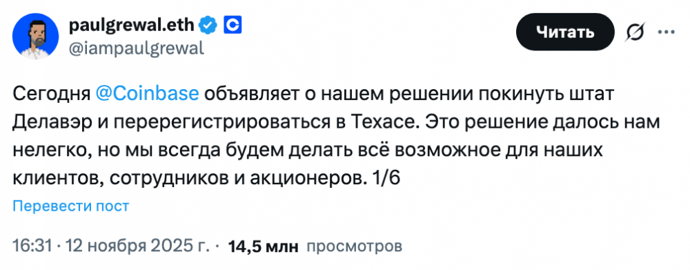 В публикации на X в среду главный юрисконсульт Coinbase Пол Гревал сообщил, что криптобиржа переведет свою регистрацию в Техас. В колонке для Wall Street Journal Гревал написал, что судебная система Делавэра стала «насыщенной непредсказуемыми исходами», в то время как Техас предлагает «эффективность и предсказуемость».