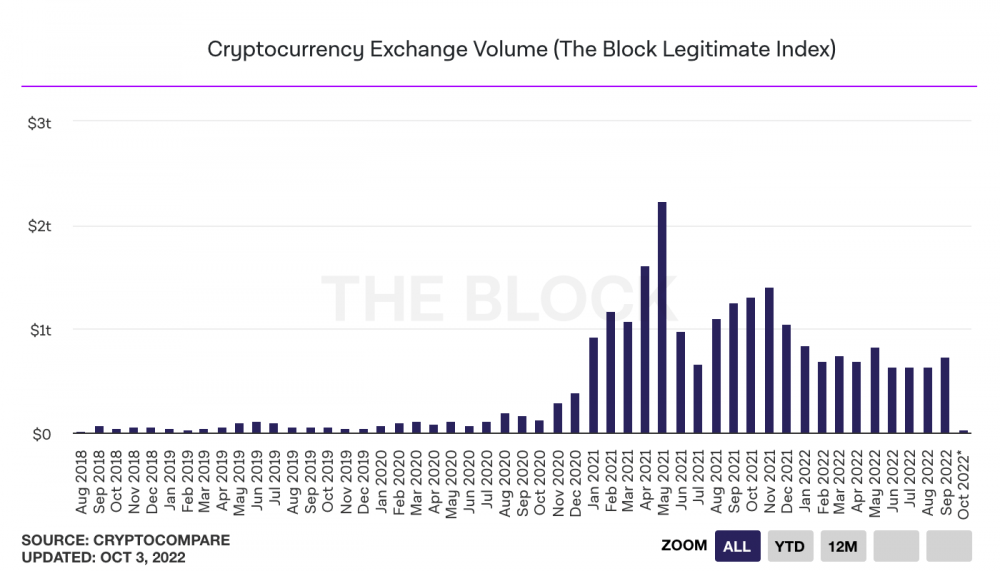 После спада на рынке криптовалют, начавшегося в мае, летом 2022 года ежемесячные объемы криптобирж оставались относительно неизменными.