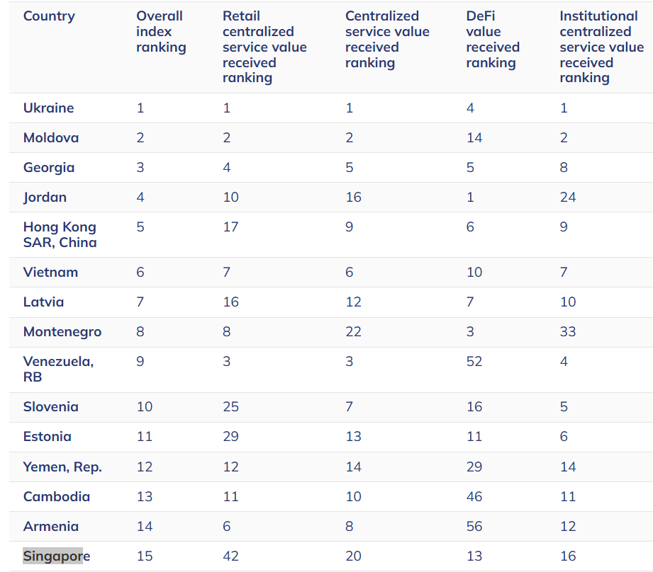 Сингапур занял 15-е место в мировом индексе принятия криптовалют, составленном компанией по анализу блокчейна Chainalysis.