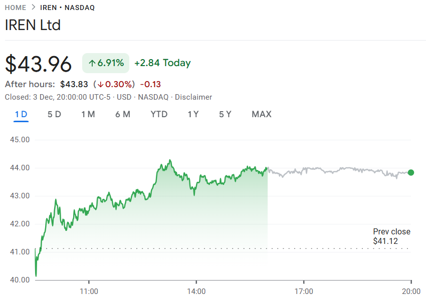 В ходе торгов в среду акции IREN подскочили на 7,6% — до $44,25. К закрытию сессии цена составила $43,96, что означает рост на 6,9%. Во вторник, после анонса планов по привлечению капитала, бумаги компании упали более чем на 15%.