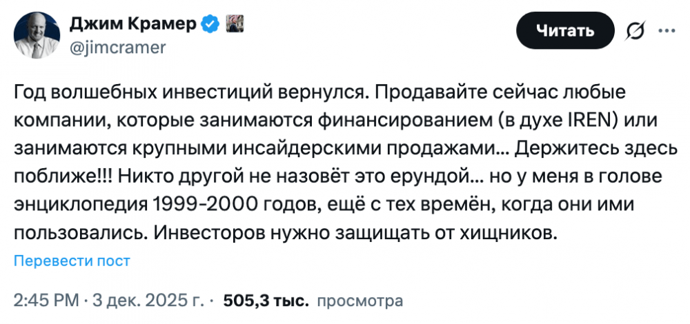 Комментатор CNBC Джим Крамер в среду в соцсети X написал, что акционерам компаний, берущих долги (в том числе IREN), стоит продавать бумаги.