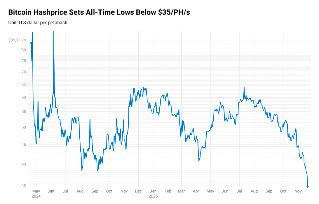 Спад последовал за относительно стабильным третьим кварталом, в течение которого средняя цена хэширования составляла около 55 долларов США за пейхеш/сек, что было обусловлено ценой BTC, близкой к 110 000 долларов США. В начале ноября растущая конкуренция в сети и падение цены биткоина привели к тому, что рентабельность майнинга достигла рекордно низкого уровня.