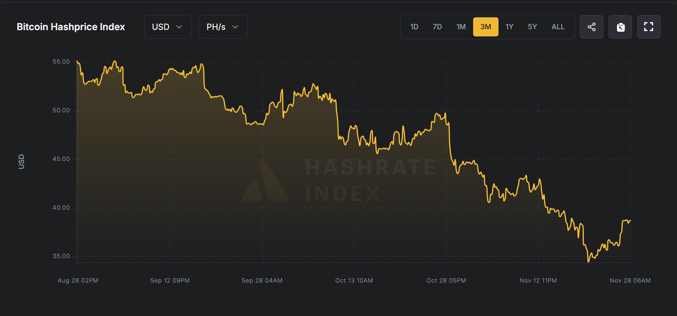 Показатель hashprice — ключевой индикатор доходности майнеров, отражающий ожидаемую прибыль на единицу вычислительной мощности, — в ноябре упал до примерно $35 за петахеш в секунду (PH/s) на фоне снижения цены биткоина до уровня около $80 тыс.