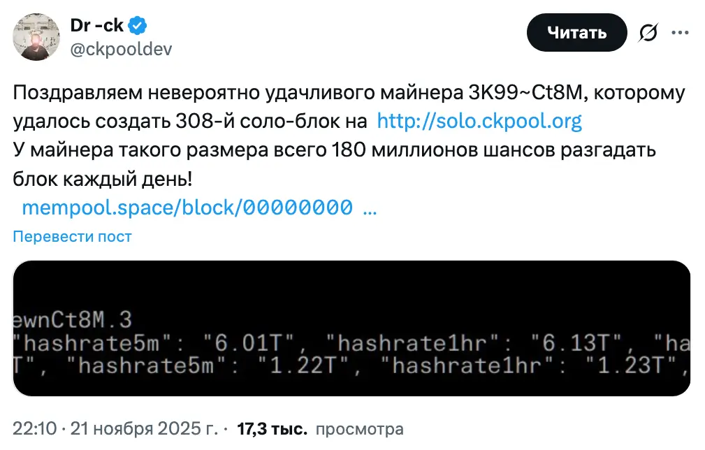 Создатель CKpool Кон Коливас объявил о победе в X, поздравив «невероятно удачливого» майнера и отметив, насколько маловероятным было это событие. По его оценкам, шансы составляли примерно 1,2 миллиона к одному в день при заявленном хешрейте майнера.