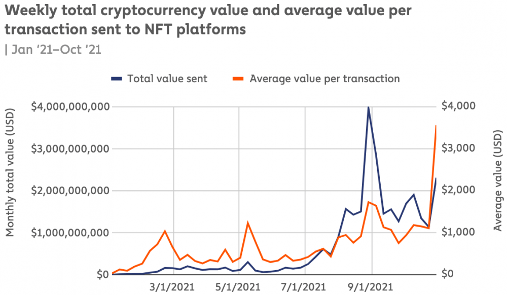 Согласно недавнему отчету Chainalysis, с января по октябрь этого года на два смарт-контракта Ethereum NFT, ERC-721 и ERC-1155 - два типа, связанных с торговыми площадками и коллекциями NFT, - было отправлено более 26,9 млрд долларов США.