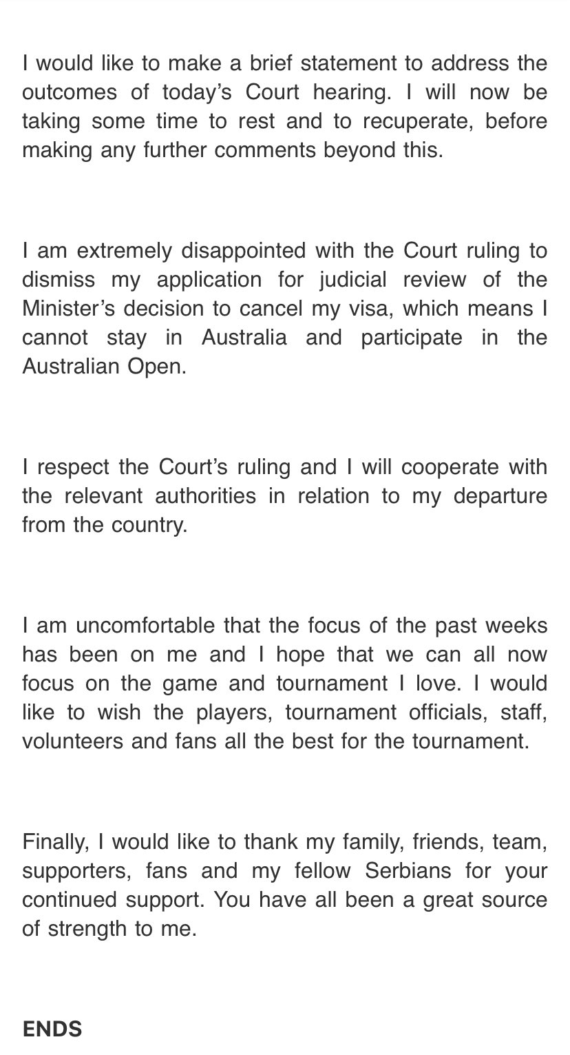 «Я крайне разочарован решением суда об отклонении моего ходатайства о судебном пересмотре решения министра об аннулировании моей визы, что означает, что я не могу оставаться в Австралии и участвовать в Открытом чемпионате Австралии по теннису. Я уважаю решение суда и буду сотрудничать с соответствующими органами в отношении моего отъезда из страны. Мне неудобно, что в последние недели все внимание было сосредоточено на мне, и я надеюсь, что теперь мы все можем сосредоточиться на игре и турнире, которые я люблю. Я хотел бы пожелать игрокам, официальным лицам турнира, персоналу, волонтерам и болельщикам всего наилучшего на турнире», - написал Джокович в официальном заявлении по итогам суда.