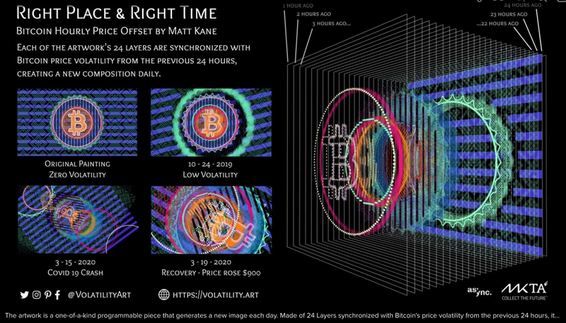 В 2020 году группа художников из Сан-Франциско, работающих в области программируемого цифрового искусства, представила произведение, внешний вид которого менялся в зависимости от колебаний цены биткоина. Проект «В нужном месте и в нужное время» художника Мэтта Кейна использовал рыночные данные BTC в качестве входных данных в режиме реального времени, позволяя изменениям стоимости криптовалюты вызывать визуальные изменения в произведении.