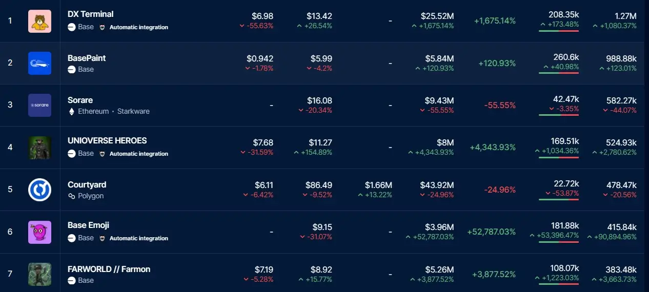 Тем временем DX Terminal от Base занял четвертое место по объему торгов с $25,5 млн. Проект продемонстрировал рост почти на 1700%, согласно данным DappRadar.