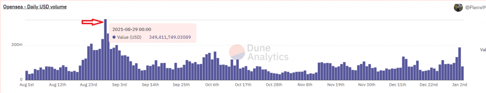 В то время как популярные наблюдатели, такие как Wu Blockchain, утверждали, что объем 3 января был рекордным для OpenSea, предыдущие данные, опубликованные rchen8 на Dune Analytics, показывают, что 29 августа был зафиксирован рекордный максимум (ATH) в 322 миллиона долларов.