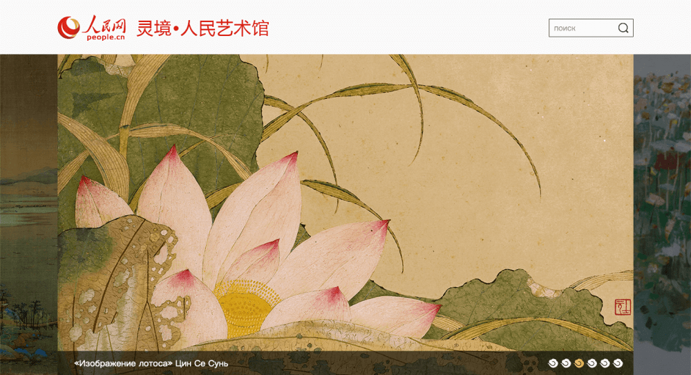 На домашней странице галереи в настоящее время представлены традиционные китайские произведения искусства известных художников, но без ценников и кнопок «Купить».