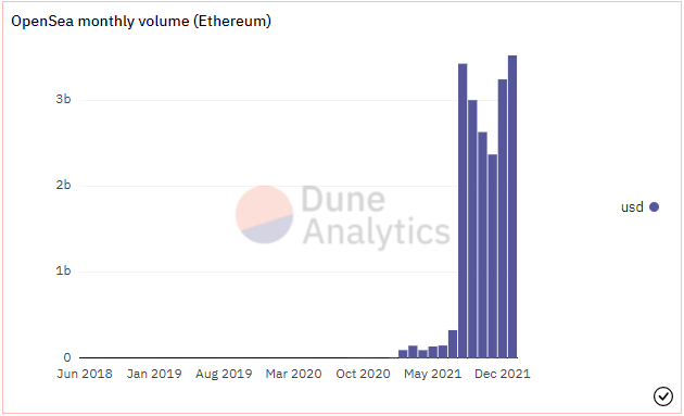За две недели до конца января, рынок токенов NFT OpenSea впервые превысил 3,5 миллиарда долларов США.