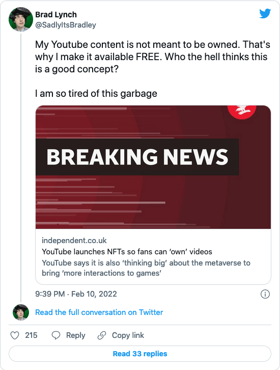 «Представитель YouTube сказал мне, что им больше нечего рассказать об огромном экологическом ущербе, который наносят NFT, хотя Google «привержен устойчивому развитию», так что это здорово».