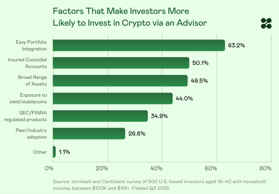 Zerohash сообщила, что, основываясь на результатах опроса, рекомендация для консультантов заключается в предложении криптовалют на единой платформе с традиционными активами при обеспечении застрахованного хранения.