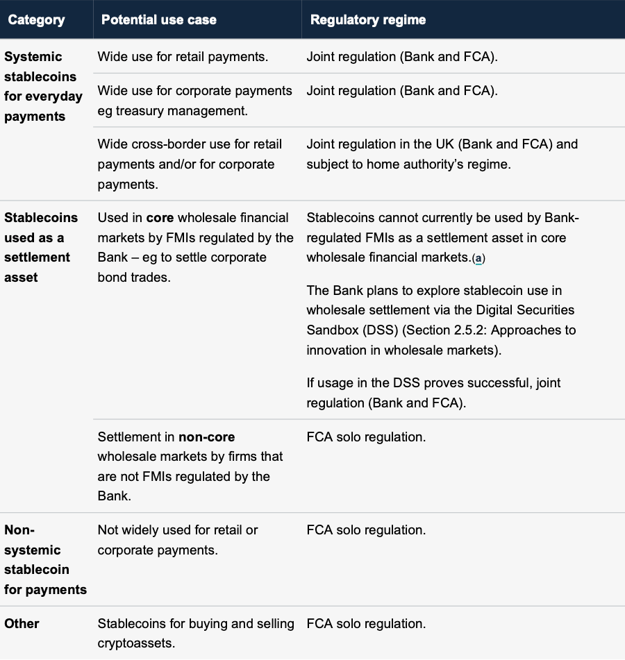 Категории стейблкоинов и соответствующие нормативные базы, выделенные Банком Англии. Источник: BoE.