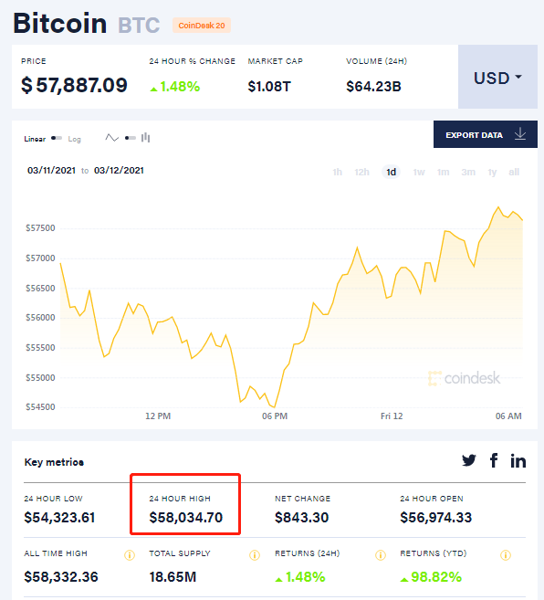 Биткоин (BTC) однажды поднялся выше 58000 долларов США и продолжает приближаться к дневному рекорду, установленному 21 февраля этого года, преодолев 58300 долларов США.