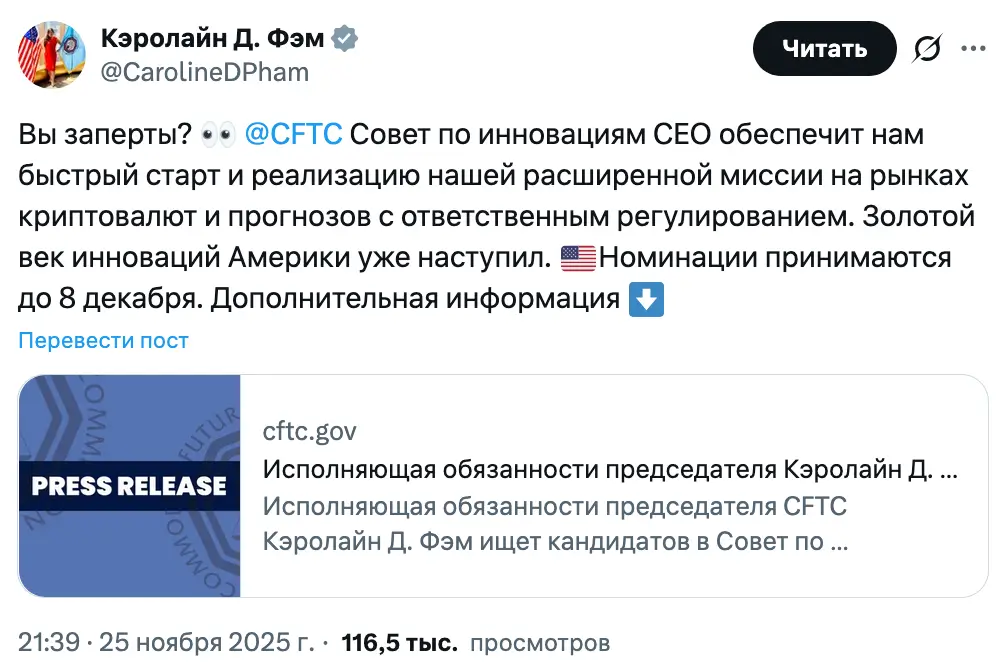 Во вторник Фам сообщила, что CFTC принимает заявки до 8 декабря на включение в «Совет по инновациям» (CEO Innovation Council). Она напомнила о предыдущих инициативах регулятора в сфере цифровых активов, включая проект Crypto Sprint, отраслевой форум по криптовалютам, а также работу Конгресса над законопроектом о структуре рынка.