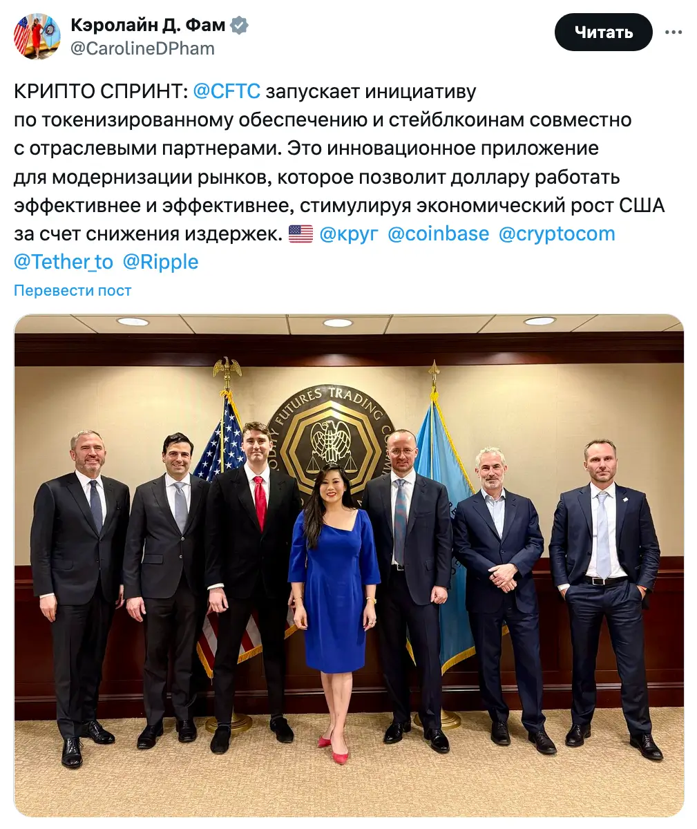 Фэм заявила, что инициатива по токенизированным активам будет основана на Форуме руководителей криптовалютных компаний CFTC и является частью ранее объявленного криптоспринта по внедрению рекомендаций Президентской рабочей группы по рынкам цифровых активов.