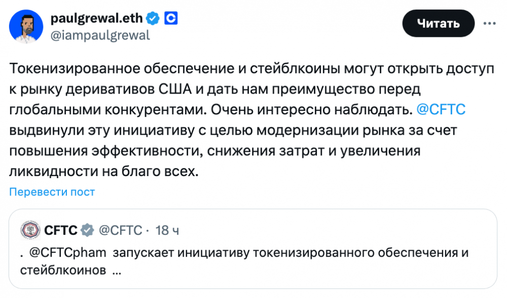 Главный юридический директор Coinbase Пол Грюал также поддержал эту инициативу и заявил в публикации X во вторник, что «токенизированное обеспечение и стейблкоины могут открыть доступ к рынку деривативов США и дать нам преимущество перед глобальной конкуренцией».