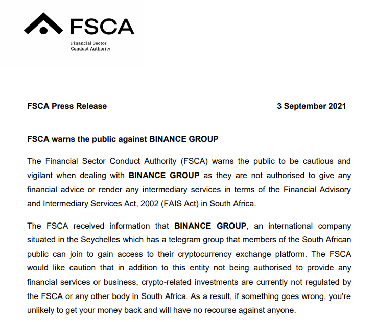 «Управление по надзору за финансовым сектором (FSCA) предупреждает общественность быть осторожной и бдительной при работе с BINANCE GROUP, поскольку они не уполномочены давать какие-либо финансовые консультации или оказывать какие-либо посреднические услуги в соответствии с Законом о финансовых консультациях и посреднических услугах 2002 года (MIS Закон) в Южной Африке», - говорится в сообщении.