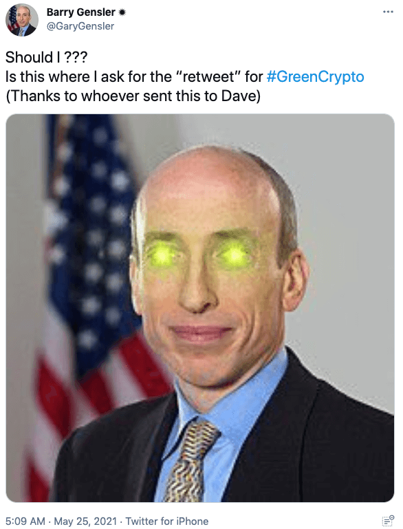 25 мая Гэри Генслер, председатель Комиссии по ценным бумагам и биржам США (SEC), призвал поддержать ретвит «Green Crypto» (GreenCrypto) и выпустил свой собственный смайлик «Green Laser Eye». Он спросил пользователей сети, есть ли у них есть возможность - «нужно подтолкнуть».