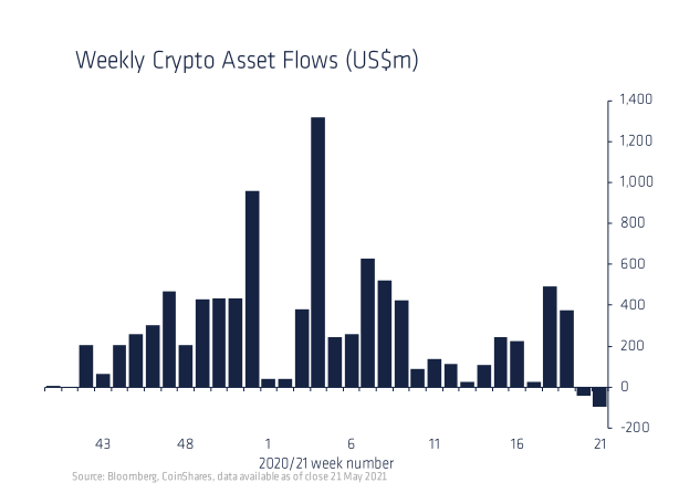 Согласно отчету CoinShares в понедельник, инвесторы извлекли чистые 97 миллионов долларов из инвестиционных фондов, связанных с криптовалютой, в течение недели, закончившейся 21 мая, или 0,2% от общего объема активов под управлением.