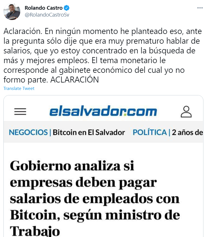 Министр труда и социального обеспечения Сальвадора Роландо Кастро написал в Твиттере, чтобы прояснить слухи о том, что Сальвадор анализирует использование биткоина для выплаты заработной платы.