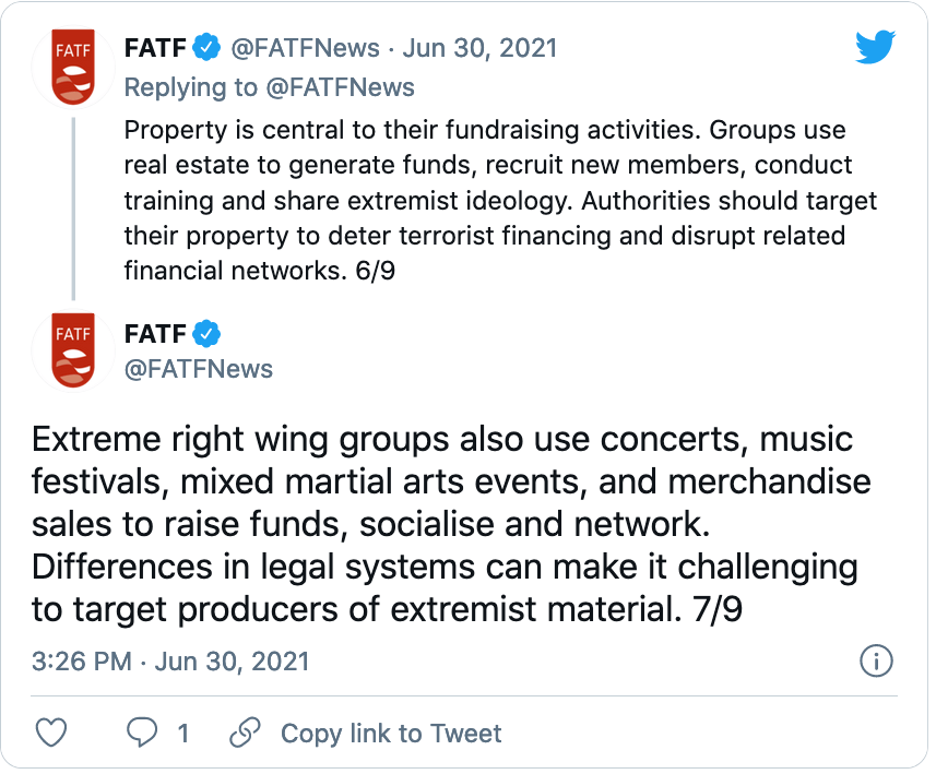 В отчете FATF, озаглавленном «Финансирование терроризма на этнической или расовой почве», указывается, что виртуальные активы, такие как биткойн, использовались экстремистами, которые постепенно закрывались от традиционных платежных платформ, точно так же, как группы крайне правого крыла (ERW) были заблокированы в социальных сетях.