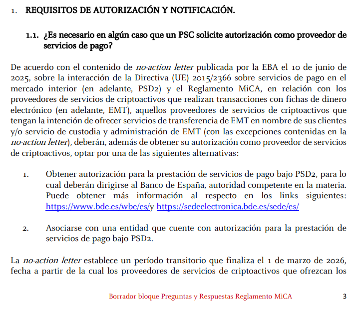 Испанский национальный регулятор рынка ценных бумаг — Comisión Nacional del Mercado de Valores (CNMV) — опубликовал вопросы и ответы о том, как будет применяться регламент ЕС о рынках криптоактивов (Markets in Crypto‑Assets Regulation, MiCA).
