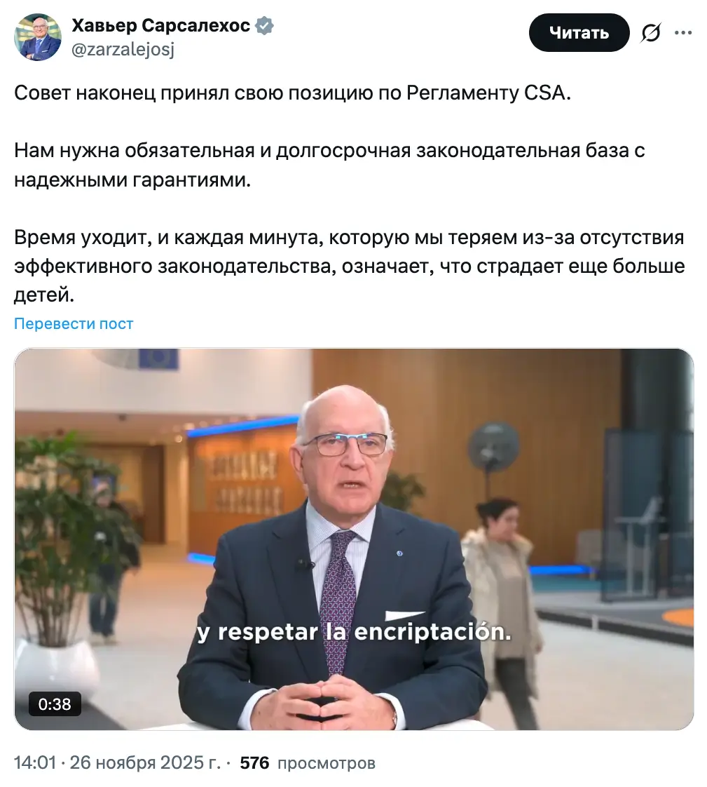 «ЕС использует сильные эмоции людей о защите детей, чтобы продвигать массовую слежку и цензуру. Предложения ЕС по законам о слежке удобно исключают чиновников ЕС из сканирования их собственных сообщений».