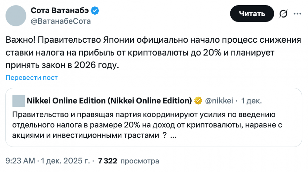 Финансовое агентство Японии (FSA) впервые представило предложения по изменению налогового режима в середине ноября. В планах — внести соответствующий законопроект в начале 2026 года. Сейчас правительство и правящая коалиция, контролирующая парламент страны (Национальное собрание), поддерживают эту инициативу.