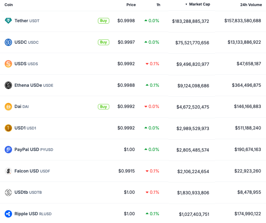 10 крупнейших стейблкоинов, привязанных к доллару США, по рыночной капитализации. Источник: CoinGecko.