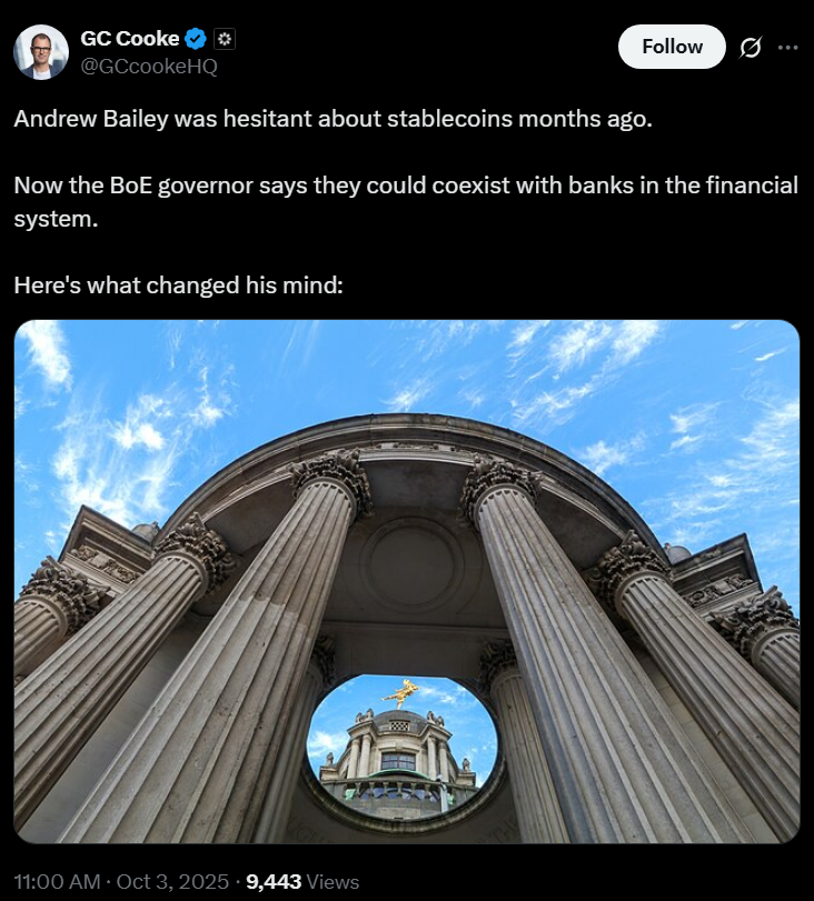 Глава Банка Англии Эндрю Бейли ранее предупреждал, что частные стейблкоины могут угрожать финансовой стабильности и подорвать способность правительств проводить денежно-кредитную политику. Однако на прошлой неделе Бейли выступил с более примирительным заявлением, признав, что стейблкоины могут представлять собой полезную инновацию, способную сосуществовать в рамках более широкой финансовой системы.