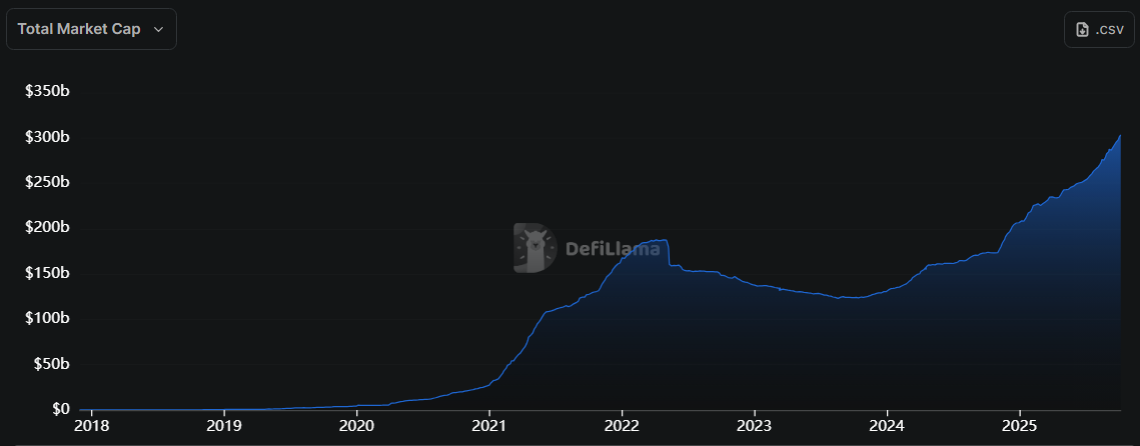 Мировой рынок стейблкоинов резко вырос до примерно 314 000 000 000 долларов, при этом подавляющее большинство токенов привязано к доллару США.